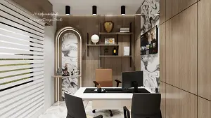 The entire boss cabin wall design starts with full wall panelling to create visual depth and structure. On the left side, an arch-shaped niche is designed to become the focal point. This niche is inlaid with a rich Onyx sheet, glowing naturally with warm undertones — ideal for showcasing idols or shooting product visuals. To enhance the elegance, the Onyx is bordered with PVC or WPC sheets that define the arch edges. A profile light runs seamlessly along the curved edge of the arch, emphasizing its shape and providing subtle, uniform illumination.Once illuminated, it casts a soft halo effect that highlights the idol placed inside — making it a perfect boss chair back wall design for photoshoots or personal decor. The Onyx sheet serves a dual purpose — it enhances the aesthetics of the boss cabin wall design while functioning as the perfect backdrop for idol photography, aligning with the client’s business purpose.This concept transforms a simple office cabin back wall design into an inspiring backdrop — one that feels luxurious yet serene. To achieve balanced proportions, a vertical plywood panel is introduced over the arch section, creating structural depth while maintaining stability across the entire wall. This plywood projection extends approximately 4 inches forward, allowing for a layered, dimensional appearance. A floating shelf is attached at this level, designed to support idols during photoshoots or display purposes. The careful combination of plywood, WPC detailing, and backlit Onyx ensures that this section remains both durable and elegant — a practical solution within the boss chair back wall design. The entire wall, including the surrounding sections, is finished in SMT or UMT wooden laminates, selected for their smooth texture and warm tone that enhances the overall cabin ambiance. On the right half of the office cabin back wall design, functionality and visual balance take precedence. This section features black-coated iron cube frames fixed over plywood shelves, designed to display the client’s professional certifications, achievements, and awards. The mix of wood and metal introduces a subtle industrial aesthetic that complements the warm wooden tones of the laminates. At the far right, a full-height Onyx panel in the same tone and texture is installed to maintain symmetry with the arch on the opposite side. This panel acts as a vertical design statement, where a TV unit is mounted for presentations or visual display. The composition of materials ensures that both sides of the director cabin back wall design align visually, maintaining balance and proportion. Facing the accent wall, a compact table unit is positioned strategically to allow an unobstructed view of the back feature. The table is finished with a Corian sheet countertop, offering a clean, seamless, and low-maintenance surface ideal for workstations. The Corian finish adds a refined, contemporary touch while maintaining durability and easy upkeep. The entire boss cabin interior design prioritizes clean lines, concealed wiring, and minimal clutter. The wall-mounted elements and lighting fixtures are carefully integrated to maintain a streamlined appearance throughout the space. The boss cabin wall design stands out for its balance between visual richness and functional detailing. The glowing Onyx arch introduces a luxurious focal point, while the right-side iron shelving and laminate panels create a grounded, executive feel. The interplay of textures — stone, wood, metal, and Corian — defines the modern corporate aesthetic while reflecting the client’s professional identity. This small boss cabin design demonstrates how thoughtful zoning, lighting, and material coordination can transform limited space into an efficient and premium environment. The result is a design that feels cohesive, practical, and contemporary — ideal for modern offices that demand both style and functionality. This boss office back wall design effectively combines modern materials with precise detailing to achieve a professional aesthetic suitable for today’s executive workspaces. The Onyx sheet arch, accent lighting, and modular shelving collectively create a balanced visual composition. Each design element — from the laminated panelling to the Corian countertop — contributes to a cohesive interior that reflects sophistication, usability, and brand identity. Whether applied in a director cabin back wall design or a small office back wall design, this approach highlights how customization and material intelligence can redefine workspace interiors with elegance and purpose.Design Overview