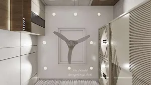 This image features a small 10×10 ft bedroom designed with a maintenance-free double tray false ceiling that adds depth and style without requiring frequent upkeep. The ceiling includes eight surface lights, providing bright, even lighting throughout the room. The clean tray layout and minimalistic lighting arrangement make the space look modern, spacious, and visually balanced—perfect for compact bedrooms where functionality and aesthetics need to work together seamlessly. This featured image is a part We are interior designers in Mehsana | Mr. Bharat Bhai Manilal Patel's Villa interior design project by Lexangrit Design Studio