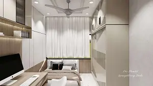 The ceiling is crafted with a clean two-step tray gypsum false ceiling, adding depth and elegance without overwhelming the space. On the right side, a sleek slider wardrobe in beige SMT laminate stands out with refined groove-cut detailing, and additional loft cabinets with black handles offer practical overhead storage. The left wall displays a subtle vertical and horizontal groove-cut pattern, adding texture and visual interest. At the foot of the bed, a compact wooden laminated study unit is neatly installed, topped with upper storage cabinets finished in beige laminate and accented with a modern fluted glass shutter, creating the perfect blend of utility and aesthetics.