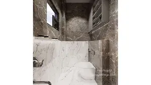 This wall continues the same brown glossy and white veined tile pattern, ensuring visual continuity across the bathroom and reinforcing a balanced, modern toilet interior design. This featured image is a part We are interior designers in Mehsana | Mr. Bharat Bhai Manilal Patel's Villa interior design project by Lexangrit Design Studio