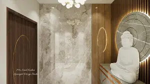 Elegant entryway entrance foyer design featuring entryway Buddha statue interior design with Buddha entrance decor, decorative louvers, and chandelier lighting. This interior foyer blends Buddha temple for home concepts with Buddha entryway decor and Buddha statue decoration, creating a peaceful Buddha room design.