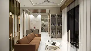 Living room showing after entrance view luxury seating area, sleek tv unit and crockery unit