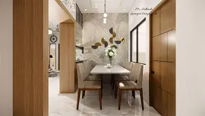 Contemporary dining area featuring a 6 seater dining table with chairs, elegant modern bulb chandelier, and a texture painted wall with decorative elements.