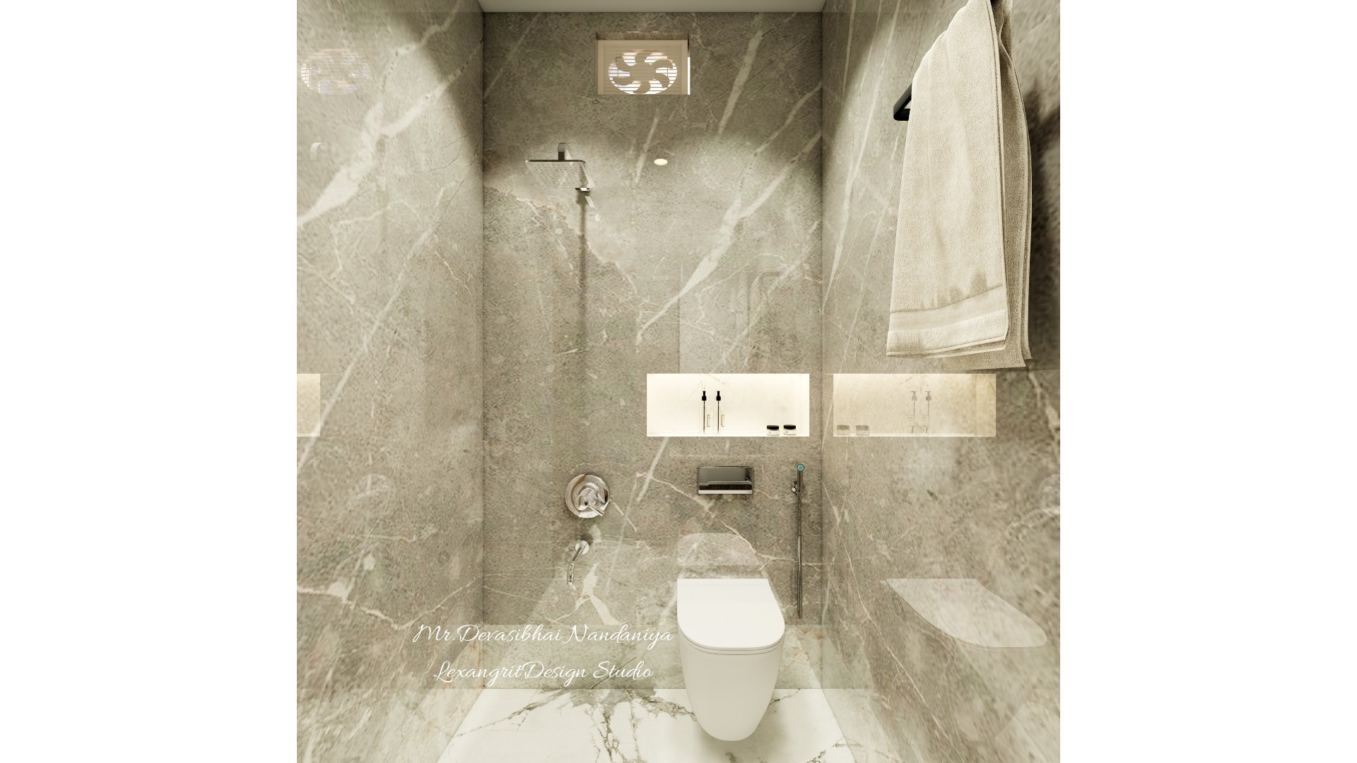 This is a parents bathroom,here we can see wall tiles with italian marble grey finish,towel hanger,left wall we've placed WC with niche and on right wall we've given counter top wash basin with WPC vanity unit .
