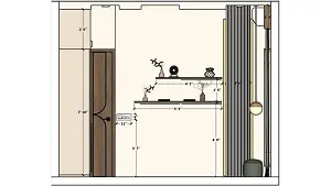 A view of the bedroom featuring floating wooden shelves with décor and a wooden textured door with white rafters, full-height white curtains on the right, a beige laminate wooden wardrobe on the left, and a sleek ceiling fan.