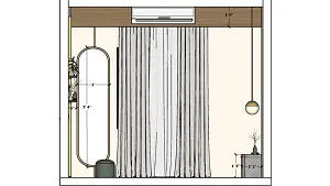 A view of the bedroom showing full-height beige curtains and a large wall-mounted mirror panel with an AC unit, a pendant light, wooden shelves with décor on the left, and a bed back featuring glossy beige laminate on the right.