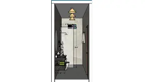 Detailed attach toilet bathroom size measurement drawing illustrating dry and wet area layout with vanity unit, commode positioning, glass-partitioned areas, and complete attach toilet bathroom size plan for accurate small bedroom washroom spatial planning.