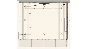 A view of the false ceiling made of gypsum, showing the layout of recessed lights, the ceiling fan, and an AC unit