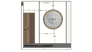 A stylish view of a modern living room featuring a circular CNC-cut Buddha face wall relief as a secondary focal point above a designer console, a large white leaf patterned accent wall behind the L-shaped sofa, and a neutral wall with a wooden textured door and window.