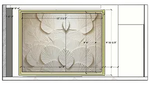 Detailed 2D dimension drawing illustrating the sofa back wall POP or HDHMR CNC leaf design, golden border framing, TV unit placement, and overall hall wall measurements.