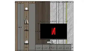 2D measurement drawing of living room TV unit showing wooden louvers panel, PU foam sheet stone wall section, storage layout, and dimension details for modern TV wall design.