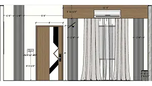 A view of the living room’s window wall featuring floor-to-ceiling curtains, a light wood textured door with a vertical white stripe, decorative wall grooves, and a shelving TV unit with warm integrated lighting, all set on Italian white marble flooring.