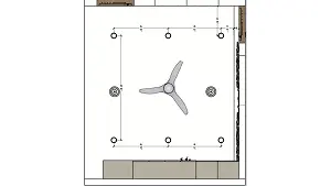 A view of the dining area ceiling highlighting a gypsum or POP false ceiling with recessed lights, pendant lights, and a centrally placed fan.