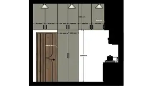 Detailed 2D kitchen layout drawing illustrating the U-shaped modular kitchen with loft cabinets, pantry unit, refrigerator position, countertop dimensions, and functional storage planning.
