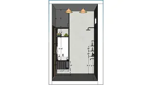 A top view of the powder bathroom featuring beige textured floor and wall tiles, a dark grey tiled accent wall with a matte black shower fixture, and a white sink in the corner highlighted by soft, warm lighting.