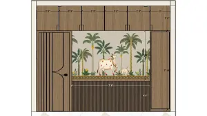 A view of the pooja room featuring a wall adorned with traditional Indian Pichwai-style wallpaper depicting cows and palm trees, flanked by wooden rafters, built-in wooden cabinetry, and a wooden door. Modern circular pendant lights hang from the ceiling above a white Italian marble floor.