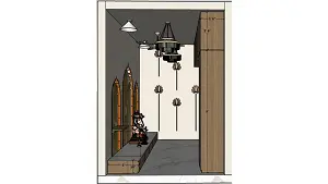 A view of the pooja room’s gypsum ceiling featuring strategically placed spot lighting, modern circular pendant lights, and a ceiling fan.