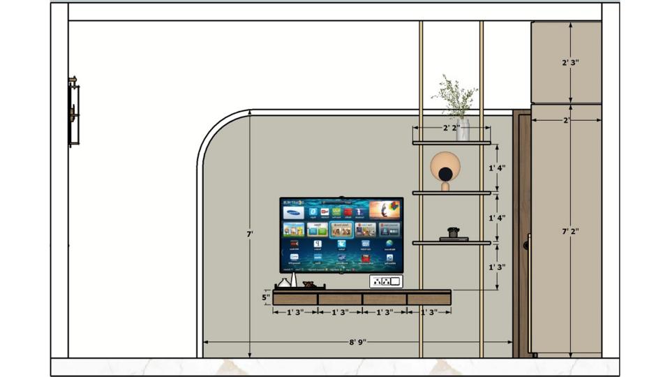 Bedroom tv unit front view and designing back wall with some open shelf storage