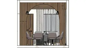 Dining area to entrance area view and showing wall panelling,wooden arch  design
