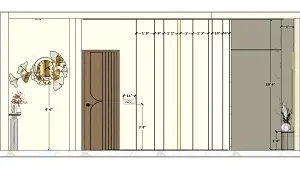 Living showcasing puja unit & open shelf storage,tv unit some storage with louvers panelling, marble sheet design