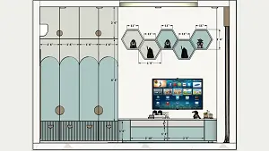 Bed front view showing tv unit, decorative wardrobe & large mirror