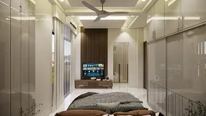 After entrance master bedroom showing sliding wardrobe & sleek tv unit with some storage,back wall louvers panelling design