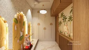 A view of the pooja room showcasing two distinct decorative walls — one side adorned with traditional Pichwai-style wallpaper depicting cows and palm trees above wooden rafters and integrated overhead wooden cabinets; the opposite wall embellished with a grey floral pattern and three glowing arched lotus-themed panels that house a Ganesha idol on a white Italian marble platform. The space is completed with white Italian marble flooring and modern circular pendant lights.