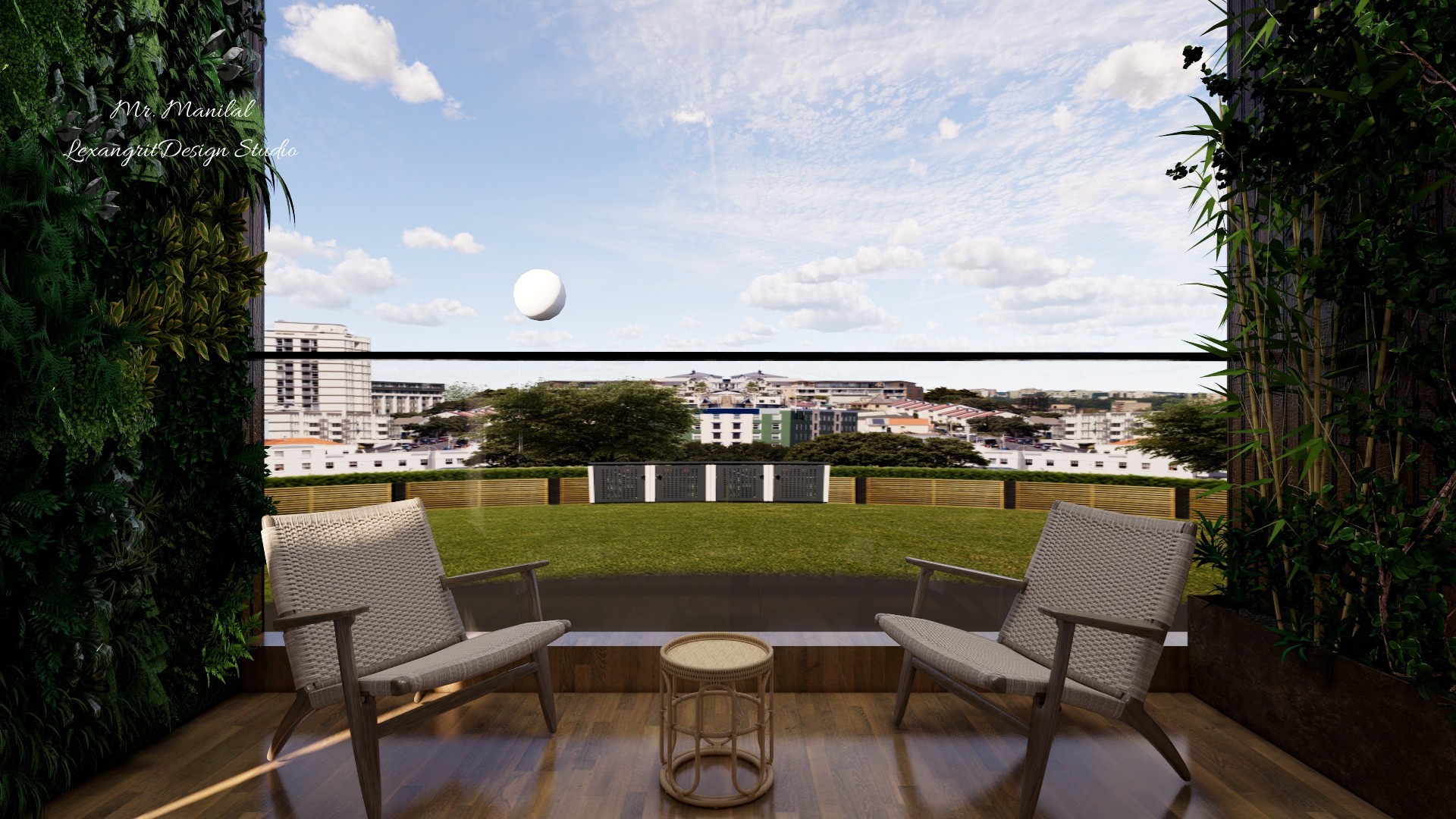 Balcony flooring with wood or wooden textured tiles , 2 chair seating with small centre table, plant walls at right & left