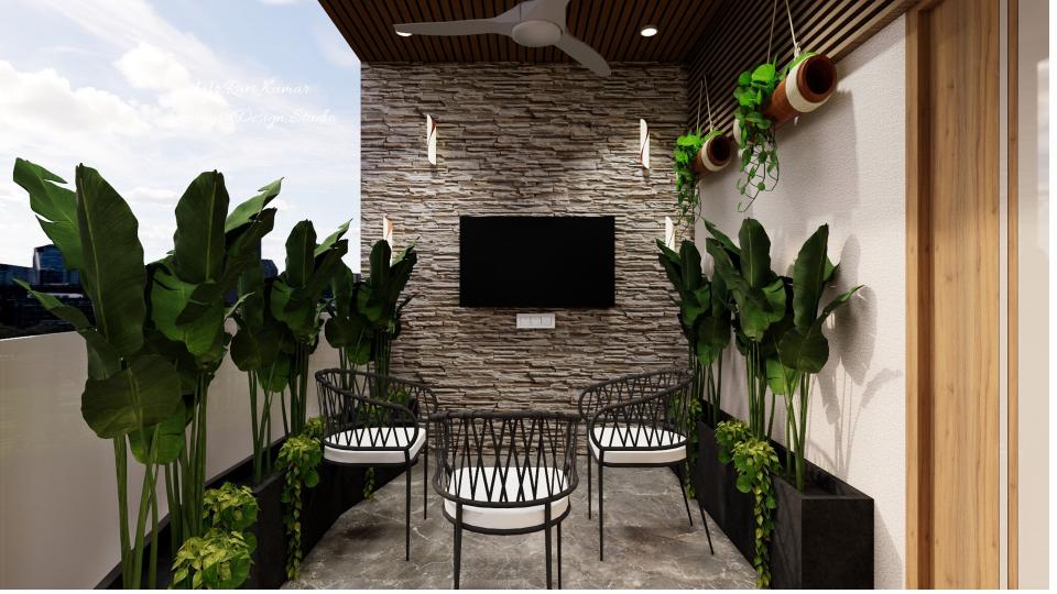 Balcony garden with a grey stone-textured stacked accent wall and wall-mounted TV, tropical plants and parapet wall on the left, and a planter box with bamboo planters and a wooden textured door on the right.