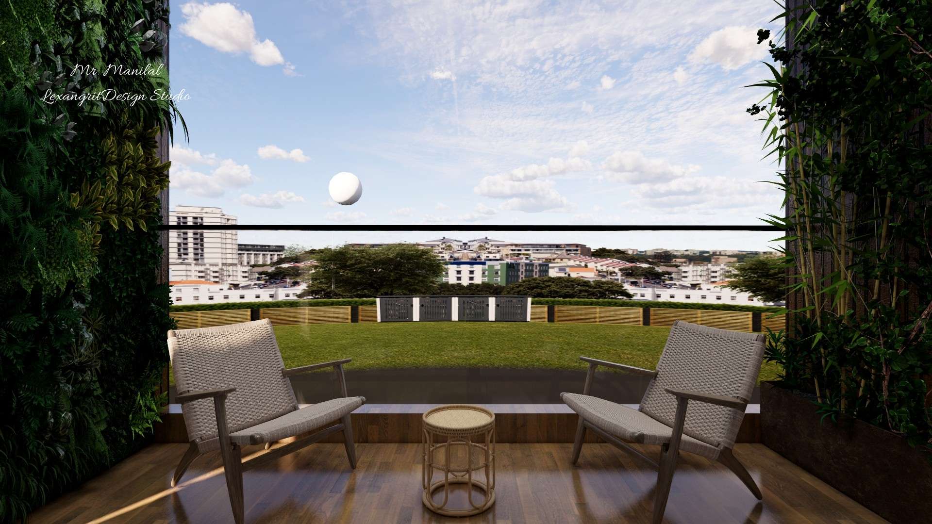 In this image we can see another view of the balcony where we can see terracotta brick wall at the left and main accent wall designed with a wall mural with brassfinish and plantary boxes beside with black textured marble tile wall,a small grass patch is given on the floor below the accent wall,flooring is designed with linear tiles with grey plain matte finish.
