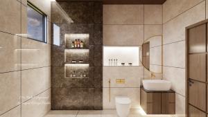 A well-planned attached bathroom layout featuring bi-color floor tiles, a sleek vanity unit, WC, and a frameless glass-separated shower zone — ideal for compact modern bathrooms in Indian homes.