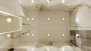 A clean bathroom gypsum false ceiling fitted with evenly spaced LED recessed spotlights — a simple, elegant ceiling treatment that provides bright, glare-free illumination across the entire bathroom without the clutter of surface-mounted fixtures.