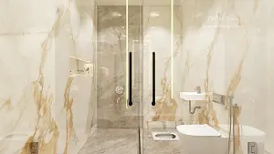 Bathroom with Indian squat toilet and wall-mounted western WC separated by glass partition with black handles and white gold marble tiles