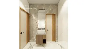 Bathroom vanity area with grey marble accent wall, wooden fluted floating vanity with vessel sink, tall rounded mirror and white marble floor