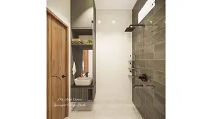 Bathroom with a dark grey tiled wall and a vanity with a white vessel sink on a black countertop integrated into a full storage unit on the left.