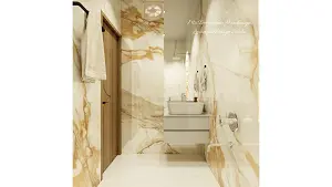White Gold Glossy Bathroom with Floating Grey Vanity and Wall Mirror