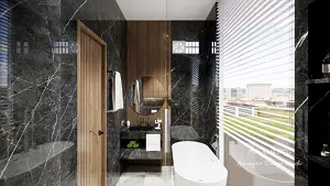 Bathrooom showing decorative vanity unit with louvers panelling and round shape mirro,bathtub