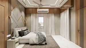 Bed side window cover in full height cuirtain hanging from wooden pelmet