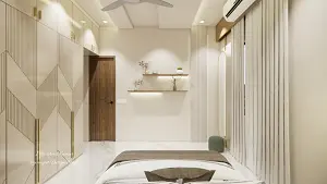 A view of the bedroom featuring floating wooden shelves with décor and a wooden textured door with white rafters, full-height white curtains on the right, a beige laminate wooden wardrobe on the left, and a sleek ceiling fan.
