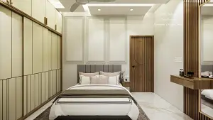 Bedroom 1 displaying luxury bbed and sliding wardrobe, decorative headboard walll