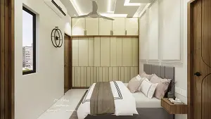 Bedroom 1 displaying luxury bed,side table and sliding wardrobe