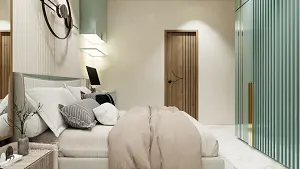 Luxury bedroom interior louvers design featuring louvers behind bed with bed back wall panelling, new bed back wall design, and bed back wall interior louvers design bedroom — a modern luxury bed louvers design bedroom with vertical white louver detailing, integrated storage, and refined false ceiling for an elegant bed wall back design.