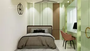Bedroom 2 luxurious bed and back wall panelling some louvers with study unit area
