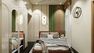 A bedroom where minimal arches meet warm textures — grey textured arch bed back, brown WPC louvers, and a wardrobe with arch mirrors and golden handles.
