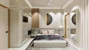 Bedroom bed back wall with grey tufted headboard, WPC wooden louvers panel, rectangular mouldings and circular gold black mural art piece