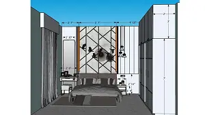 2D elevation working drawing of bedroom dresser with large mirror and profile light alongside bed back wall elevation showing exact dimensions by Lexangrit Design Studio