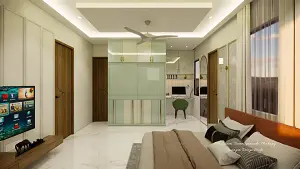 Bedroom showcasing luxury bed ,sleek tv unit and decorative sliding wardrobe with study unit