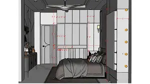Bedroom showing decorative wall and headboard design with sliding wardrobe 2d dimensions