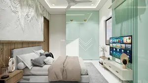 Bedroom showing luxurious bed, sleek tv unit with back side wall design & sliding wardrobe