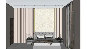 2D front elevation working drawing of the low budget bedroom bed back wall — showing exact dimensions of HDHMR panelling, wallpaper placement, recessed light positions and bedside table layout for precise on-site execution.